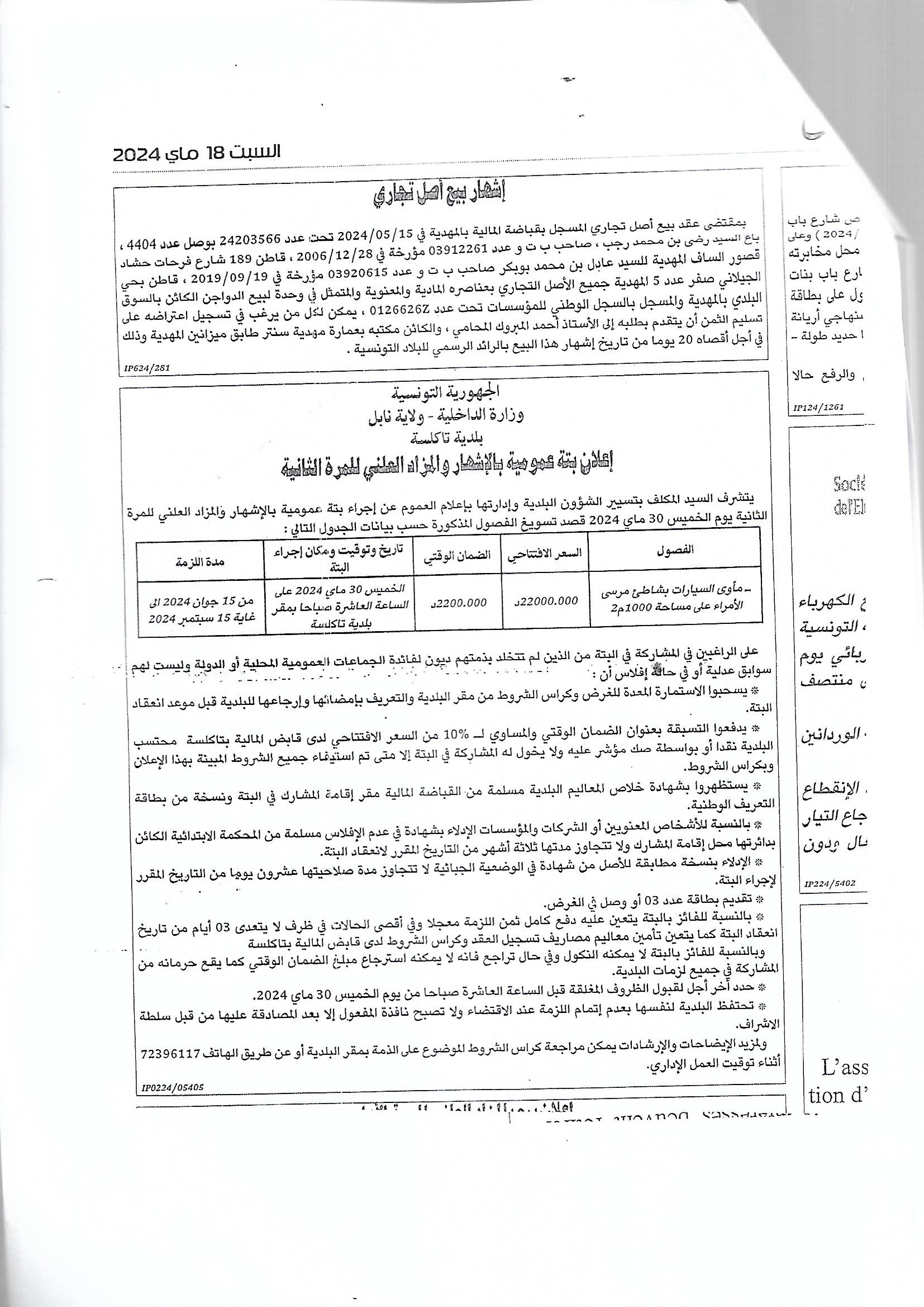 بلاغ حول بتة عمومية بالمزاد العلني للمرة الثانية