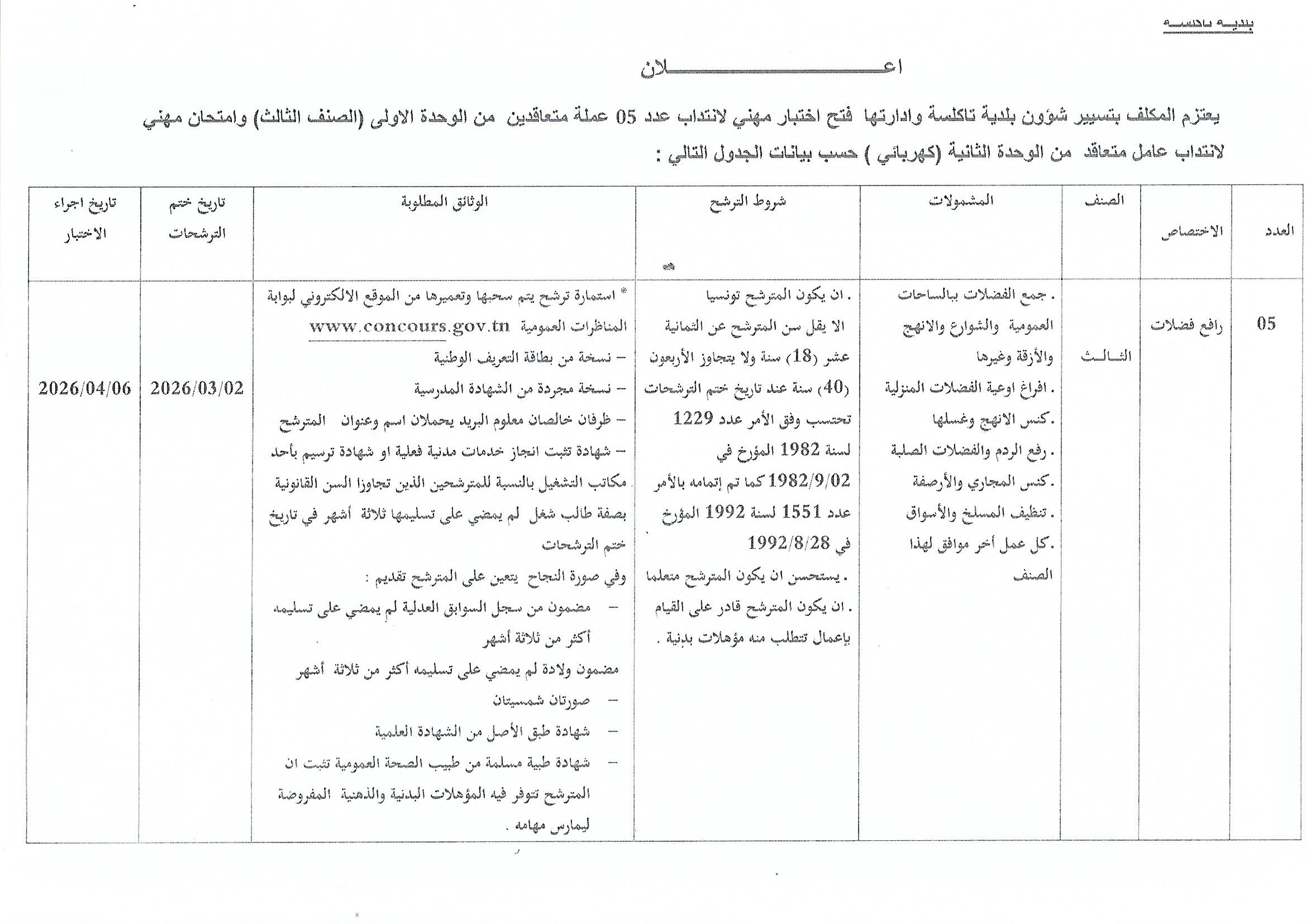 مقرر يتعلق بفتح اختبار مهني لانتداب عدد 05 عملة متعاقدين من الوحدة الاولى لسنة 2026