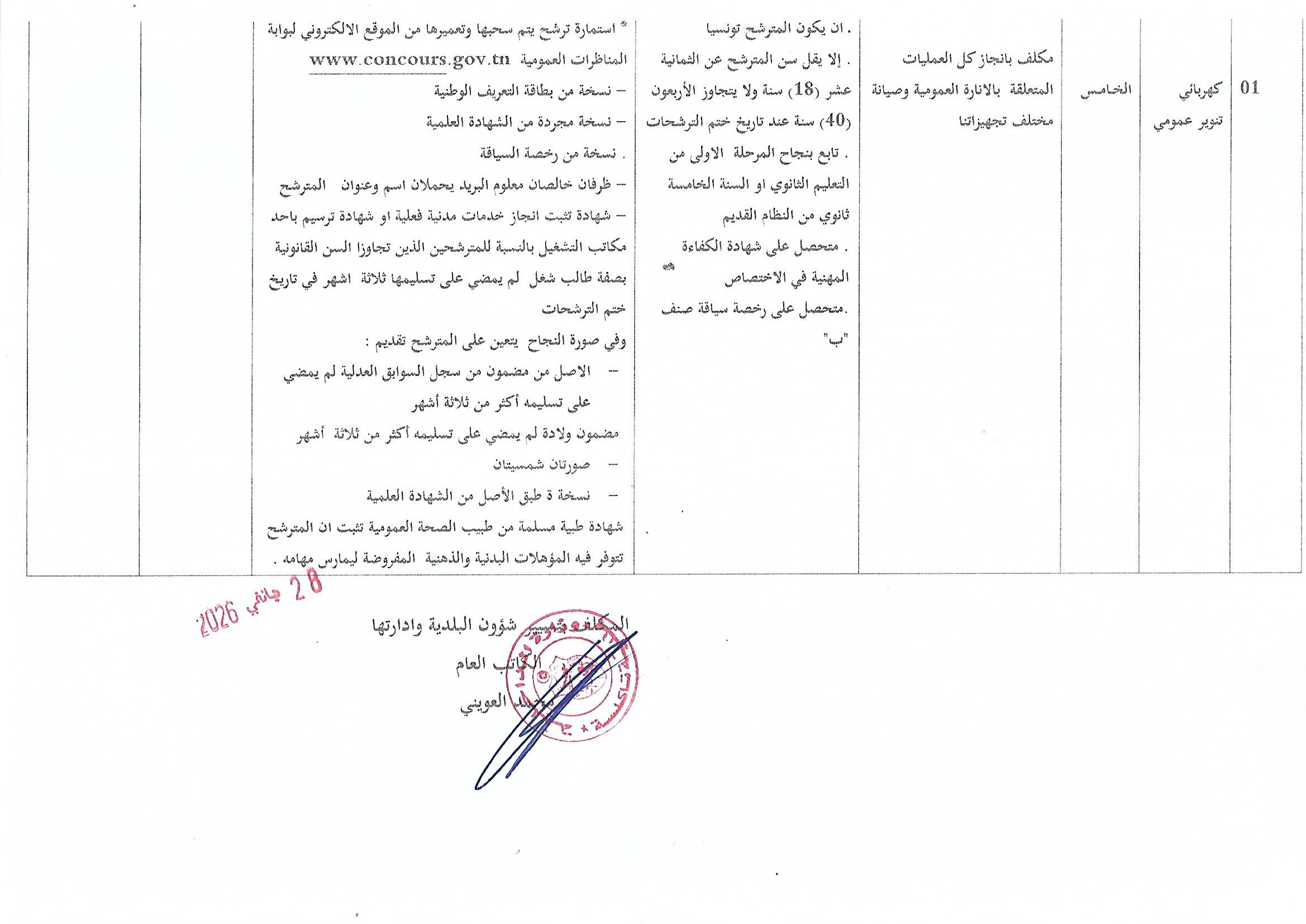 مقرر ضبط انتداب عدد 01 عامل متعاقد اختصاص كهربائي تنوير عمومي بعنوان سنة 2026