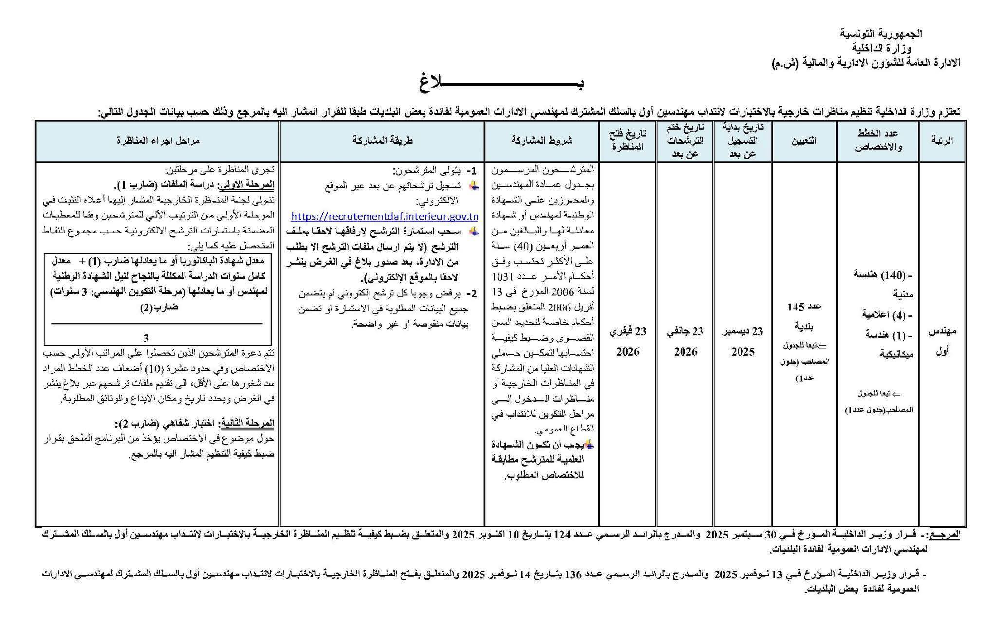 بلاغ حول تنظيم مناظرة خارجية بالاختبارات لانتداب مهندسين بالسلك العمومي لفائدة البلديات
